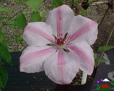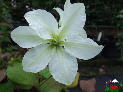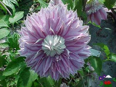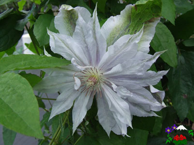 Spring flowers semi-double 15cm. bluish-mauve later with single creamy bluish-white flowers, anthers light brown. This has the vigour of 'Jackmani', but it is remotely a "white jackmani". Spring and autumn flowering. (xB) Strong grower!