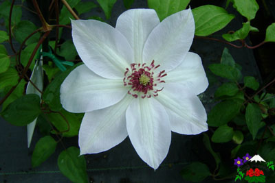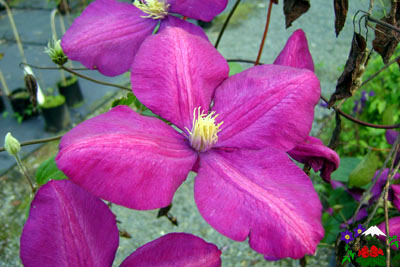 Flowers deep purple with reddish tinge, tepals x5-6. This is one of the best late purple clematis, anthers greenish beige. (xC) Summer and autumn flowering.