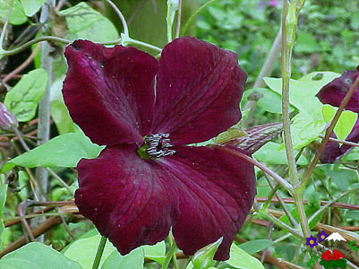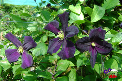 Flowers dark violet with contrasting greenish-yellow anthers. Tepals x4-6. The flowers are almost black on first opening. (xC) Summer and autumn flowering. Certificate of Merit, British Clematis Society, 1998. 'Romantika' needs a lighter coloured partner to show up at its best. Suggestions are 'Victoria', 'Perle d'Azur', 'Prince Charles', or any lighter coloured matching partner. |