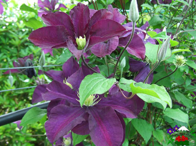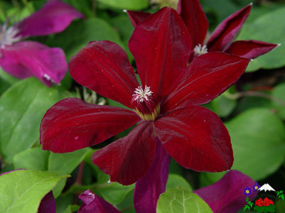 Flowers purple red 15-18cm dia., tepals x6-8, anthers red. Mid spring and early autumn. Best in East or West, fades in sun. (xB) |